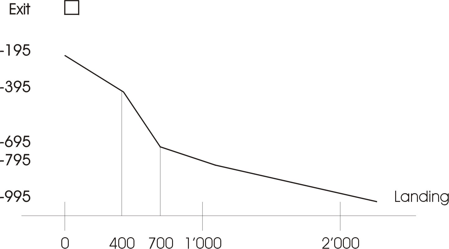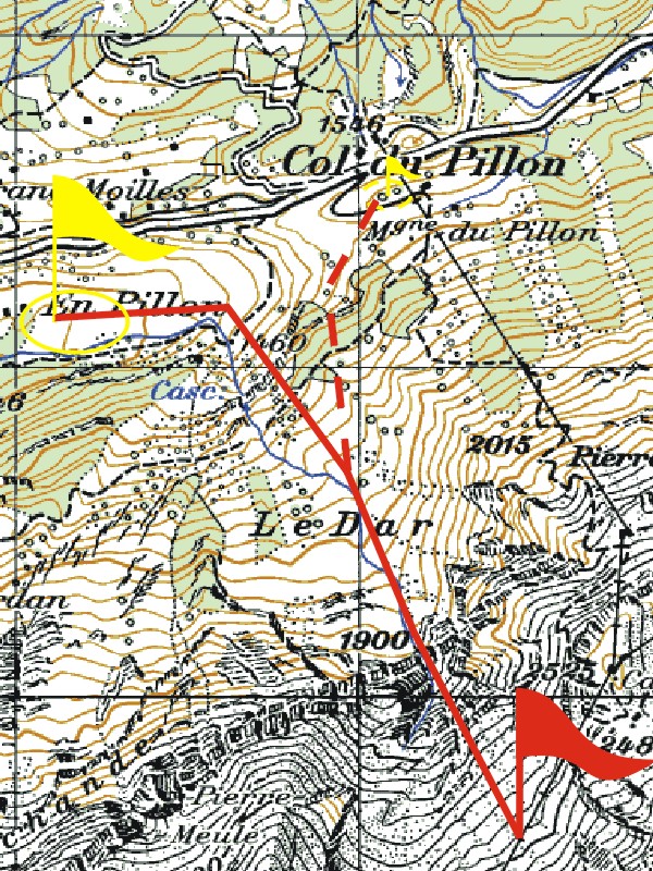 Map of the region at 50'000 scale. The red flag is at the exit point. The big yellow is the main landing place and the little yellow is the alternate landing place.